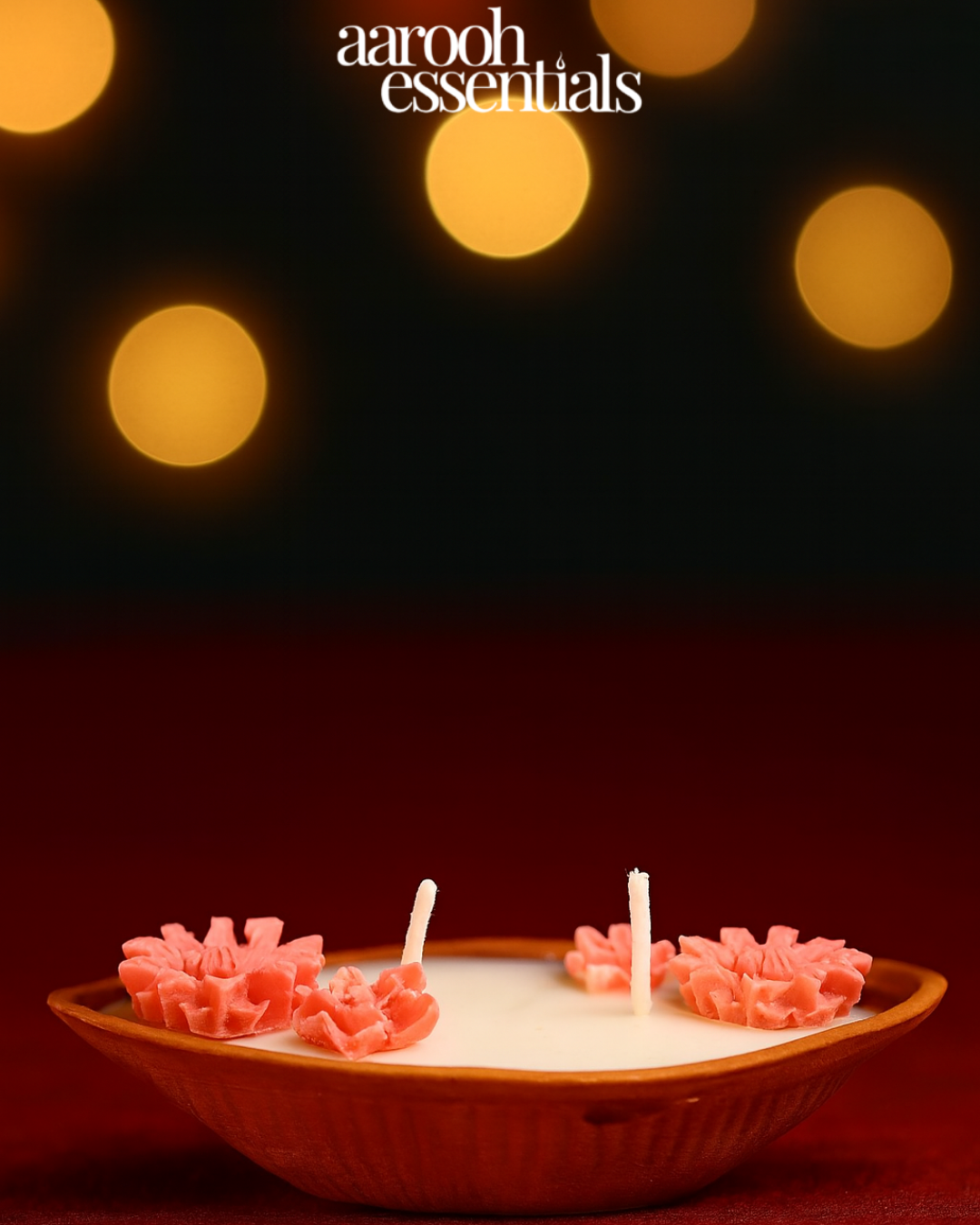 Handcrafted in a rustic terracotta base, this candle is adorned with delicate pink floral wax designs that bloom beautifully as the flame dances. Perfect for festive décor, puja rituals, or gifting, it adds a touch of tradition blended with modern artistry. Its warm glow and charming floral accents make it an eye-catching centerpiece for any celebration.